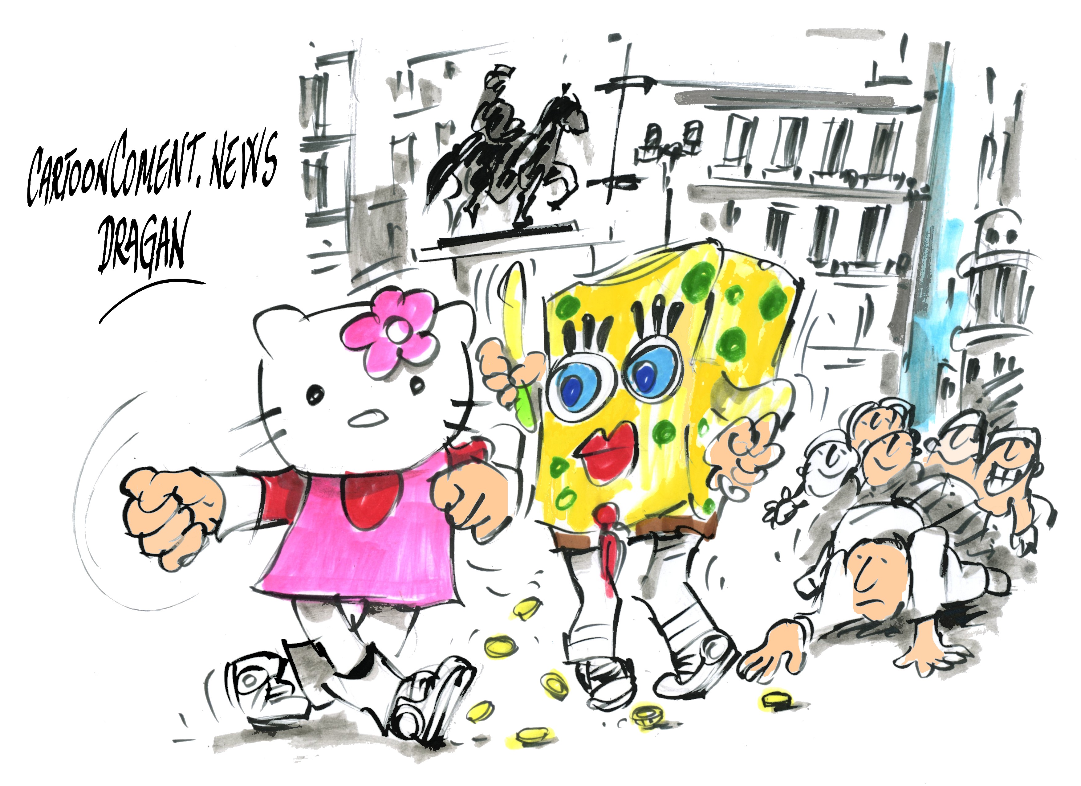 Los muñecos de Hello Kitty y Bob Esponja soprendieron a decenas de personas al acabar hace varios días a tortazo limpio en la Puerta del Sol de Madrid en la ‘lucha’ diaria que mantienen los muñecos por conseguir el mejor sitio de la plaza para hacerse fotos con los visitantes.